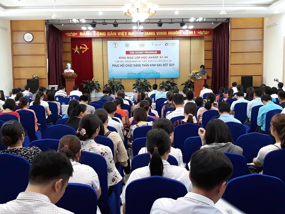 Khóa tập huấn nằm trong khuôn khổ Chương trình hợp tác giữa Việt Nam và Cộng hòa Áo đã được Bộ Y tế phê duyệt.Tham dự lớp tập huấn có PGS.TS Nguyễn Thị Xuyên – Nguyên Thứ trưởng Bộ Y tế, Chủ tịch Tổng hội Y dược học Việt Nam; BSCKII.TTUT Nguyễn Văn Vy – Chủ tịch Hội Y Dược học Hải Phòng; TS. Lê Hoàng Anh – Trưởng đại diện EVER Pharma tại Việt Nam và khu vực Đông Dương; Ban Giám đốc Bệnh viện Phục hồi chức năng, đại diện Trung tâm TT GDSK. Cùng dự lớp tập huấn là các chuyên gia đầu ngành đến từ các bệnh viện của thành phố và cả nước; với sự tham gia của hơn 160 học viên là các bác sĩ, kỹ thuật viên của các bệnh viện, trung tâm y tế, trạm y tế trên địa bàn thành phố.