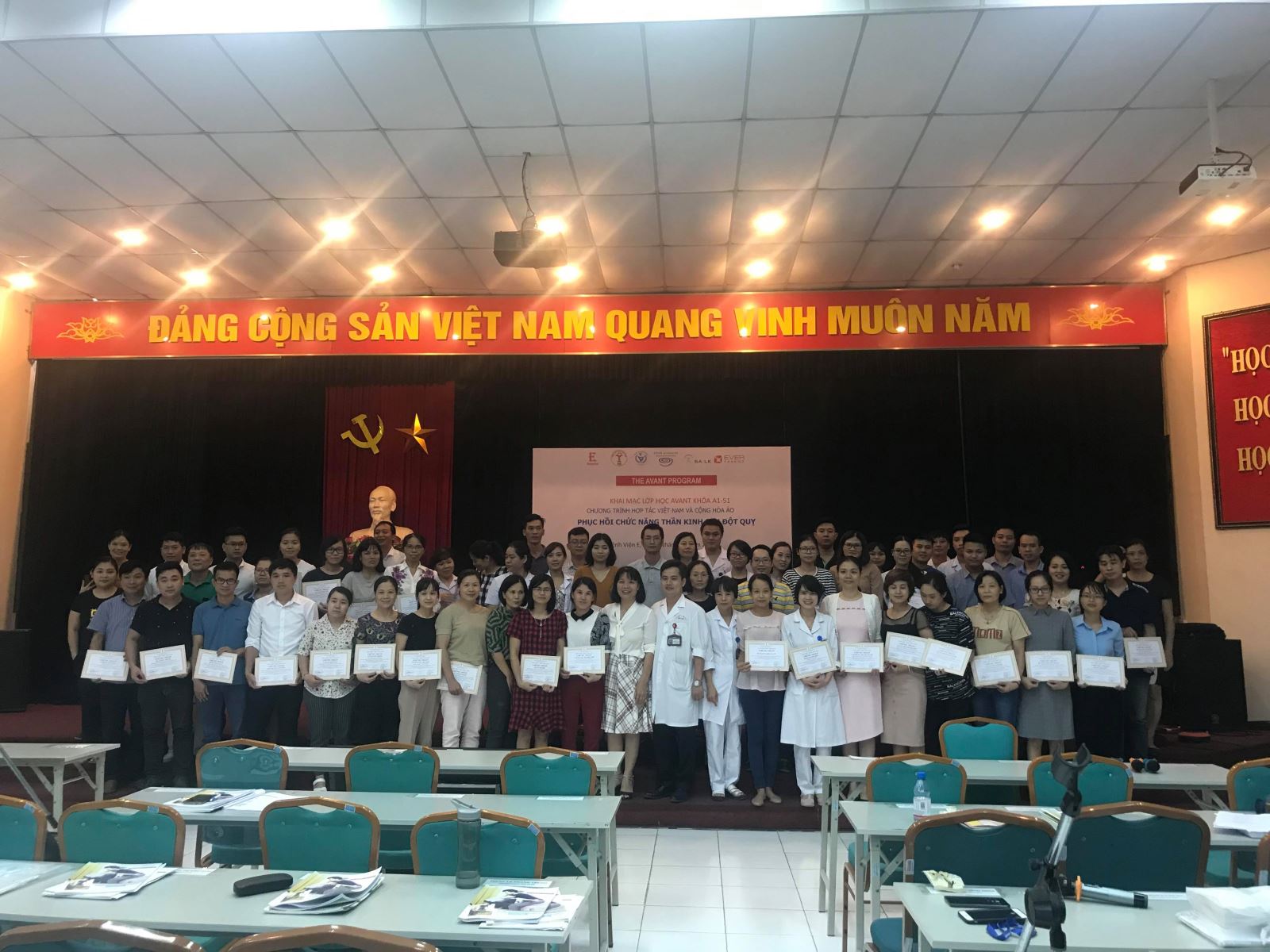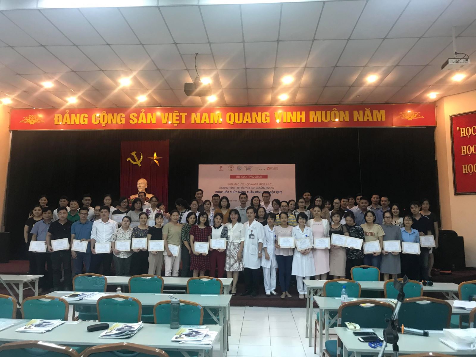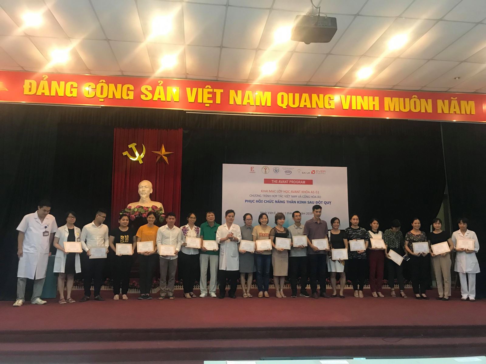 Khoá A1-51 thuộc chương trình AVANT - Phục hồi chức năng Thần kinh sau đột quỵ, tập huấn cho các cán bộ y tế đã diễn ra tại Bệnh viện E Trung ương từ ngày 01/10 - 04/10/2019. 63 học viên là các bác sĩ và kỹ thuật viên liên quan đến chuyên ngành đột quỵ, thần kinh, phục hồi chức năng... đã hoàn thành khóa học, vượt qua bài kiểm tra cuối khóa và được nhận chứng chỉ CMEs tương đương 48 giờ học quy đổi (cấp bởi Tổng hội Y học Việt Nam, Tổ chức Đột quỵ Thế giới và Hội Phục hồi chức năng Việt Nam).