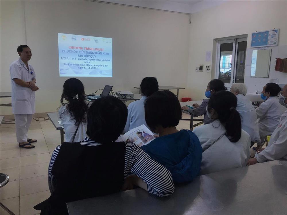 Ngày 13/11/2020 vừa qua, tại bệnh viện 354 đã diễn ra lớp tập huấn phuc hồi chức năng sau đột quỵ dành cho người chăm sóc bệnh nhân trong khuôn khổ chương trình AVANT với sự tham dự của người chăm sóc và người nhà bệnh nhân đột quỵ.