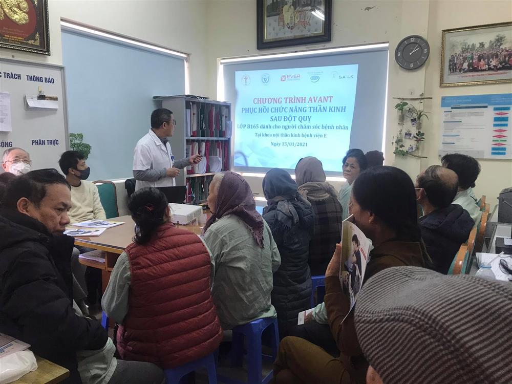 Ngày 07/01/2021 vừa qua, tại bệnh viện E đã diễn ra lớp tập huấn phuc hồi chức năng sau đột quỵ dành cho người chăm sóc bệnh nhân trong khuôn khổ chương trình AVANT với sự tham dự của người chăm sóc và người nhà bệnh nhân đột quỵ.