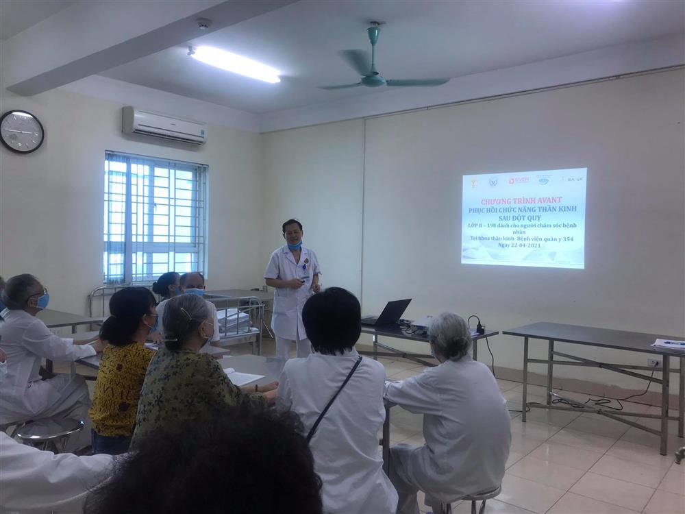 Ngày 22/04/2021 vừa qua, tại bệnh viện 354 đã diễn ra lớp tập huấn phuc hồi chức năng sau đột quỵ dành cho người chăm sóc bệnh nhân trong khuôn khổ chương trình AVANT với sự tham dự của người chăm sóc và người nhà bệnh nhân đột quỵ.