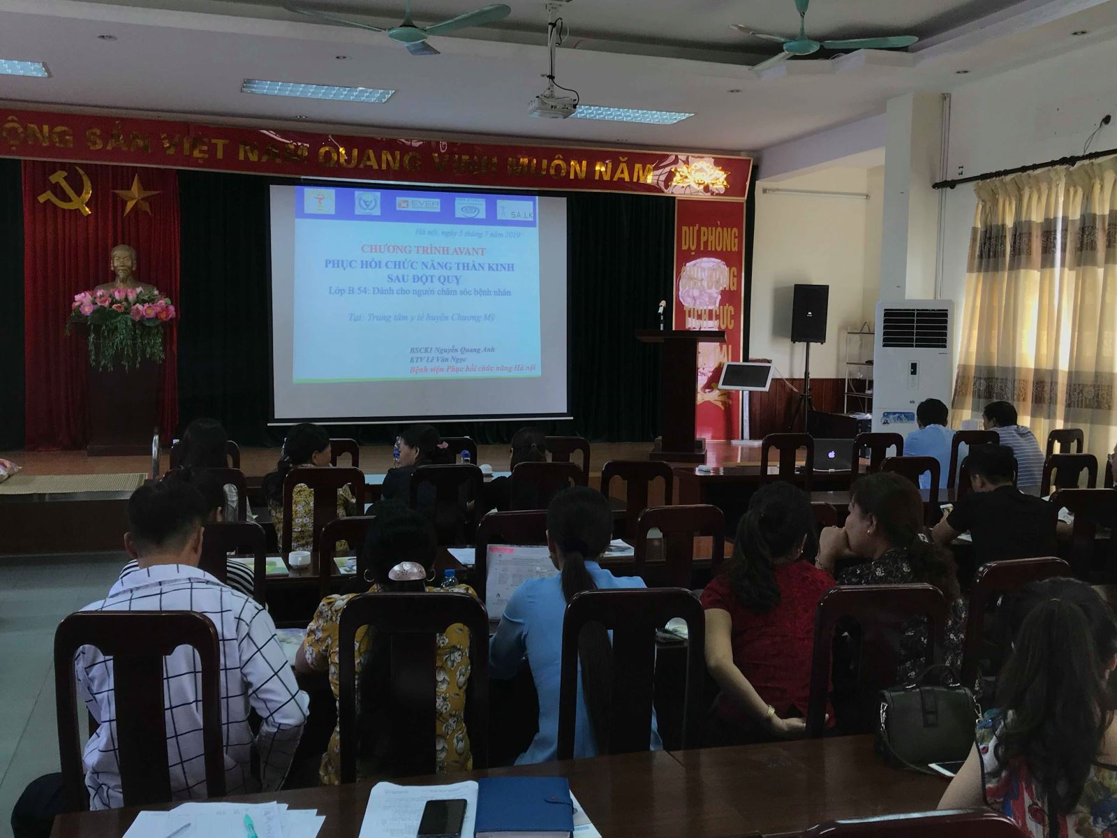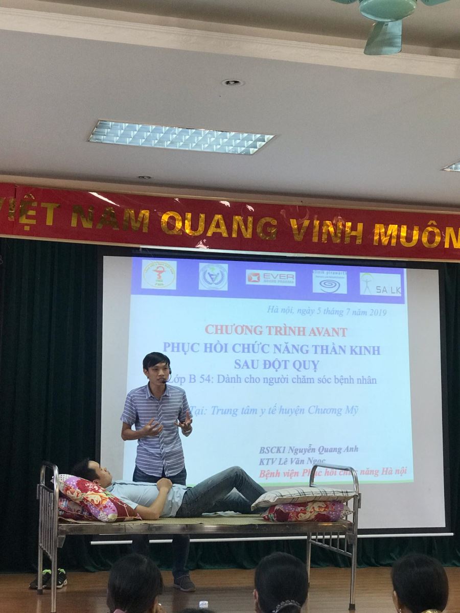 Ngày 5/7/2019 vừa qua, lớp B54 dành cho người chăm sóc bệnh nhân trong khuôn khổ chương trình AVANT – Phục hồi chức năng thần kinh sau đột quỵ đã được tiến hành tại Huyện Chương Mỹ với sự tham dự của gần 120 người nhà bệnh nhân đột quỵ.
