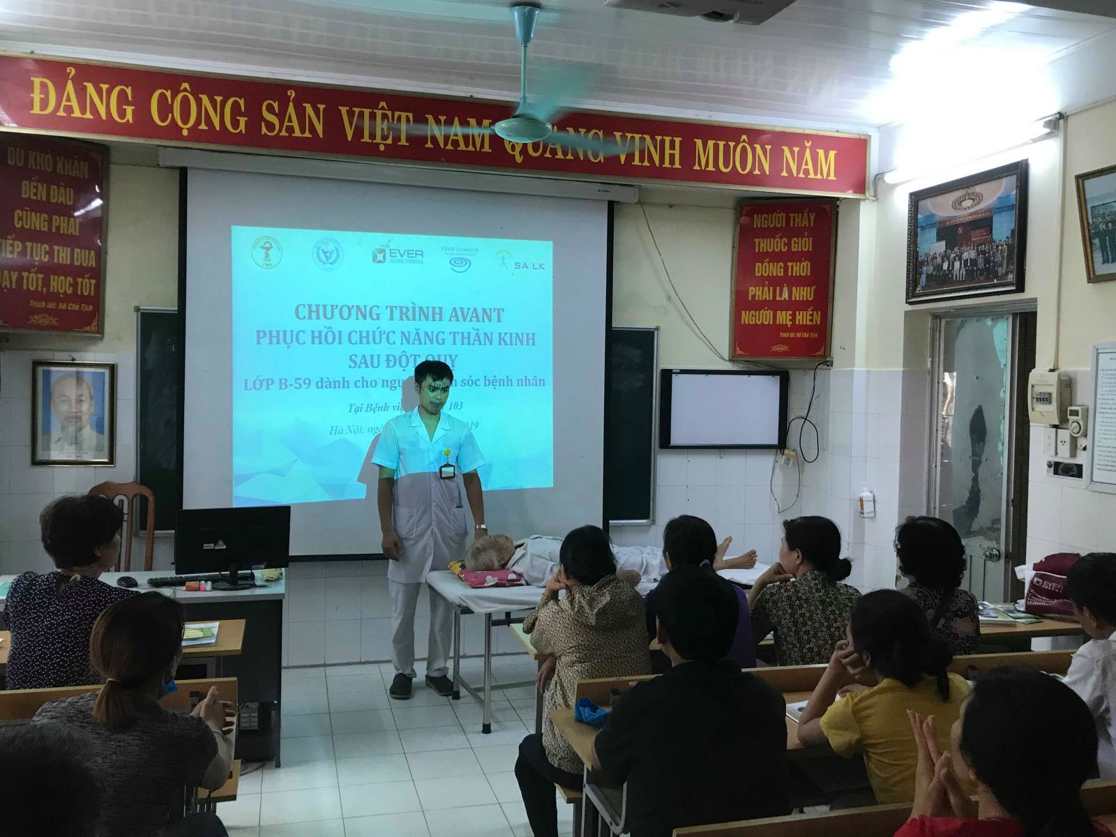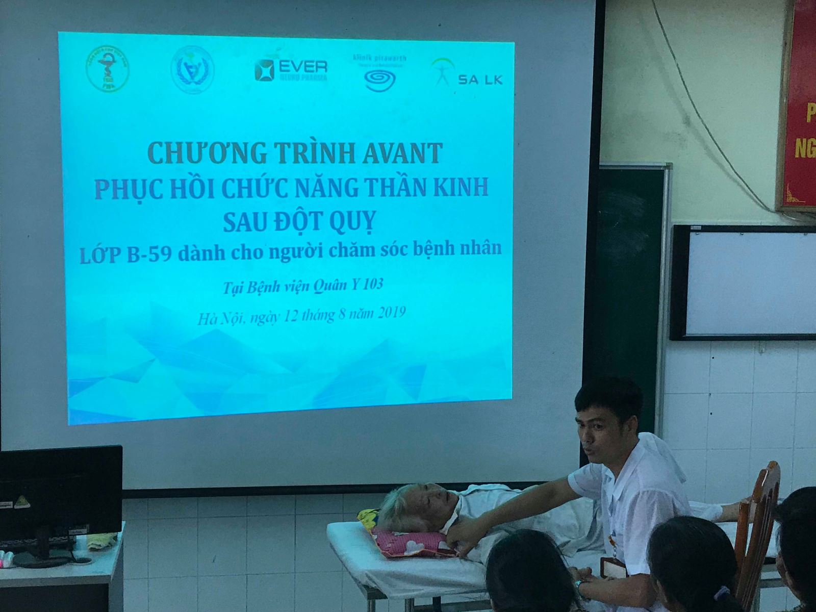 Ngày 12/8/2019 vừa qua, lớp B59 dành cho người chăm sóc bệnh nhân trong khuôn khổ chương trình AVANT – Phục hồi chức năng thần kinh sau đột quỵ đã được tiến hành tại Khoa Đột quỵ Bệnh viện Quân y 103 với sự tham dự của 25 người nhà bệnh nhân đột quỵ.