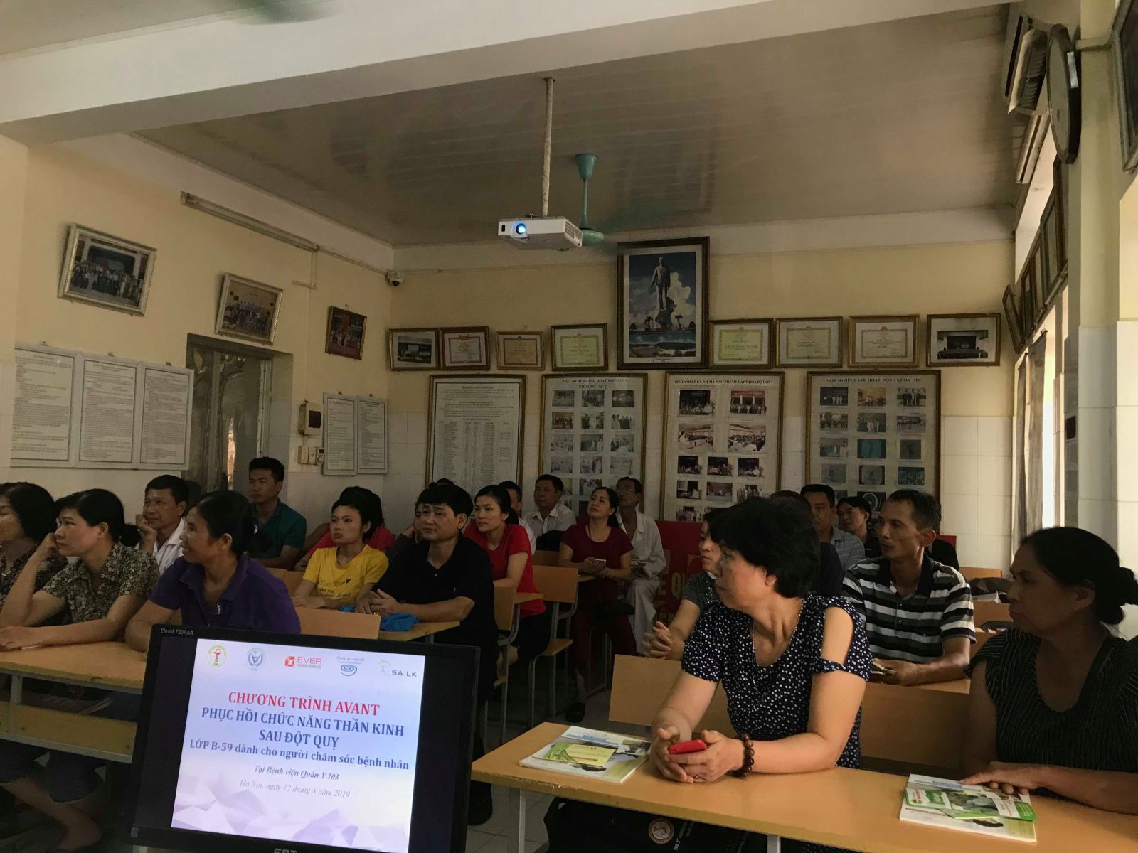 Ngày 12/8/2019 vừa qua, lớp B59 dành cho người chăm sóc bệnh nhân trong khuôn khổ chương trình AVANT – Phục hồi chức năng thần kinh sau đột quỵ đã được tiến hành tại Khoa Đột quỵ Bệnh viện Quân y 103 với sự tham dự của 25 người nhà bệnh nhân đột quỵ.