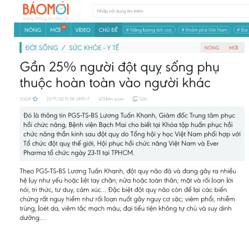 Ngày 23/11/2020, Báo Mới đưa tin về Khóa tập huấn phục hồi chức năng thần kinh sau đột quỵ do Tổng hội y học Việt Nam phối hợp với Tổ chức đột quỵ thế giới, Hội phục hồi chức năng Việt Nam và Ever Pharma tổ chức ngày 23-11 tại TPHCM trong bài "Gần 25% người đột quỵ sống phụ thuộc hoàn toàn vào người khác"