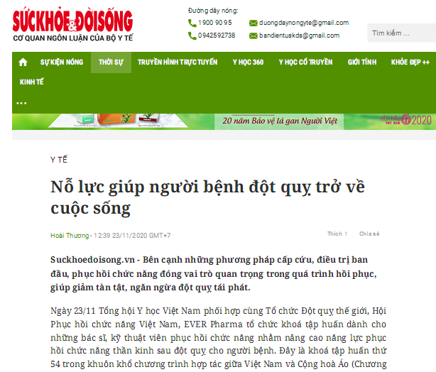 "Ngày 23/11 Tổng hội Y học Việt Nam phối hợp cùng Tổ chức Đột quỵ thế giới, Hội Phục hồi chức năng Việt Nam, EVER Pharma tổ chức khoá tập huấn dành cho những bác sĩ, kỹ thuật viên phục hồi chức năng nhằm nâng cao năng lực phục hồi chức năng thần kinh sau đột quỵ cho người bệnh. Đây là khoá tập huấn thứ 54 trong khuôn khổ chương trình hợp tác giữa Việt Nam và Cộng hoà Áo (Chương trình AVANT- Phục hồi chức năng thần kinh cho bệnh nhân sau đột quỵ) đã được Bộ Y tế phê duyệt.